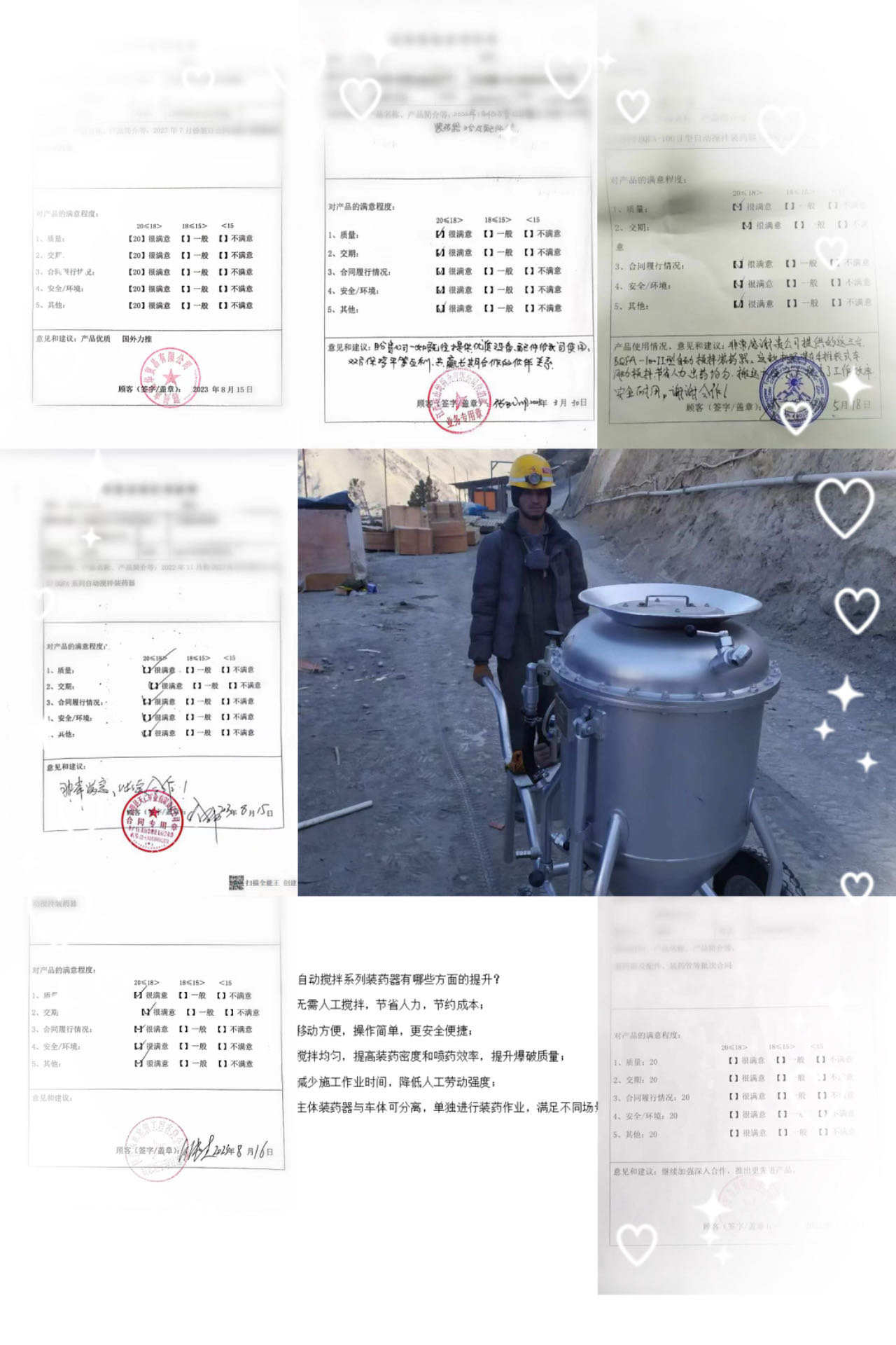 BQFA型自動攪拌系列裝藥器,與人工攪拌相比,無需人工攪拌,節(jié)省人力且攪拌均勻,移動方便,操作簡單便捷,大大降低人工勞動強(qiáng)度,提高裝藥密度、爆破質(zhì)量,減少施工作業(yè)時(shí)間。先后出口塔吉克斯坦、老撾,秘魯,尼日利亞、法國等國家,使用情況反饋中得到一致好評并大力推薦。